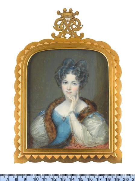 | A Lady, wearing blue dress with white, sheer, puff sleeves with blue embroidery at the white lace cuff, fur stole, blue enamel b | |