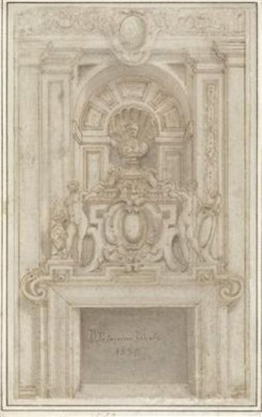 | Architectural design for an open fire place with an escutcheon and figures | |