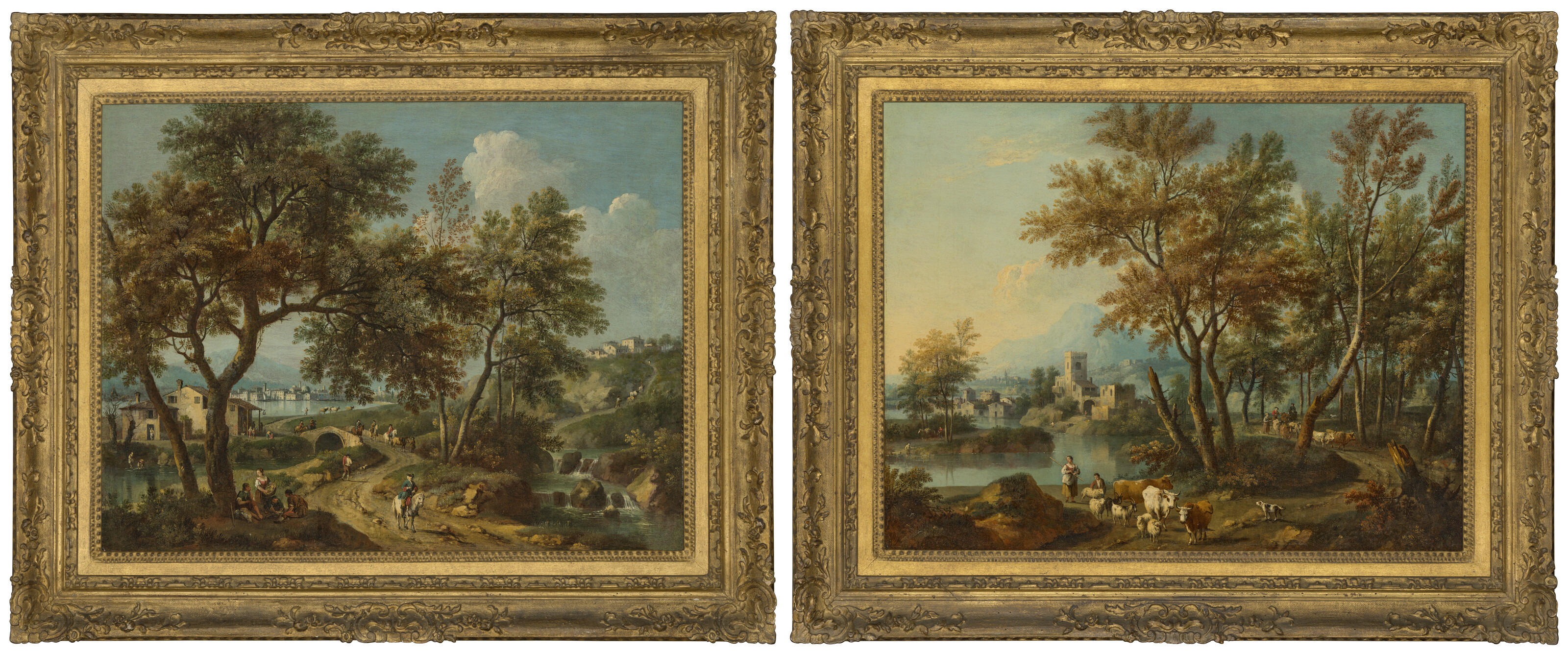 An Italianate landscape with a view of Lake Garda and Salo in the distance with figures on a bridge; and An Italianate landscape with a view of Lake Garda with a shepherd and shepherdess watering their flock at a river