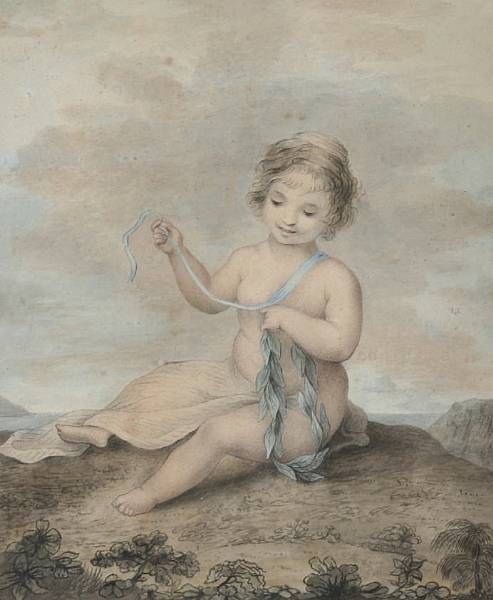 A child seated before a landscape, playing with a ribbon