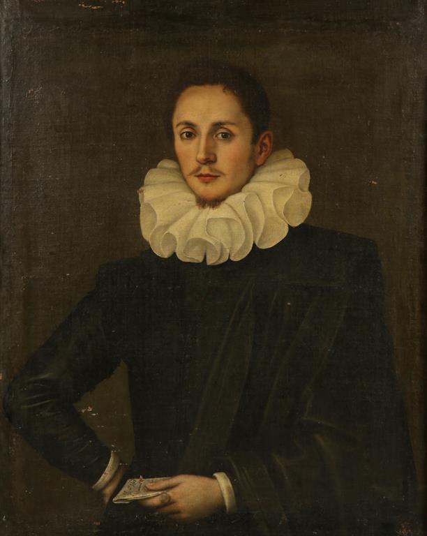 | A portrait of a gentleman standing half-length holding a letter, inscribed "Al moles Moroni" | |