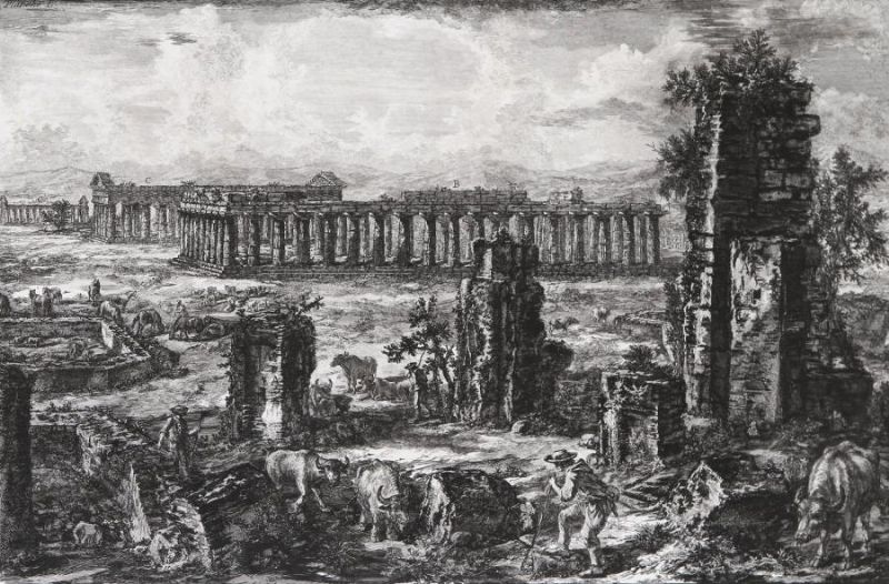 | Planche tirée de Paestum Vue de ce qui reste encore des murs de l’ancienne ville de Pesto, planche I de la suite Paestum | |