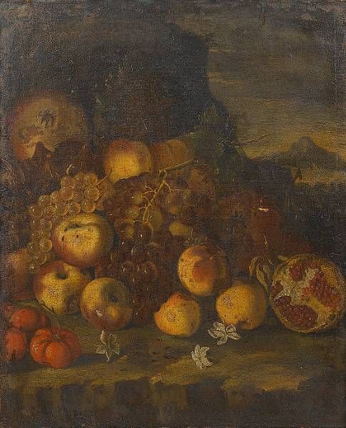 | Pomegranates, apples, grapes and figs on a stone ledge in a landscape | |