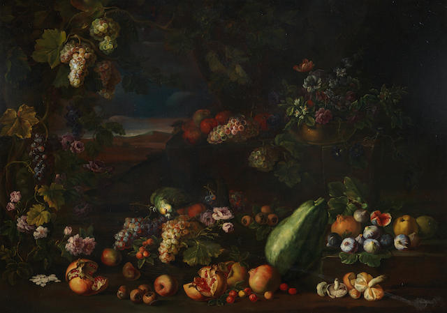 | Pomegranates, figs, grapes and other fruit on a forest floor with a parrot and a dish of flowers | |