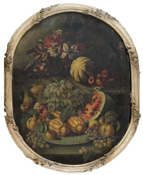 NATURA MORTA DI FIORI E FRUTTI CON VASSOIO DI CERAMICA
