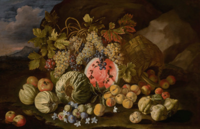 | WATERMELON, MELON, GRAPES, APPLES, POMEGRANATES, PEACHES, FIGS AND QUINCES IN A LANDSCAPE | |