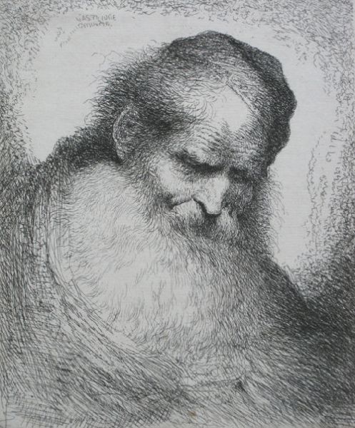 | Bearded Old Man with His Head Leaning Forward Wearing A Skull Cap, Facing Right | |