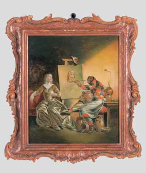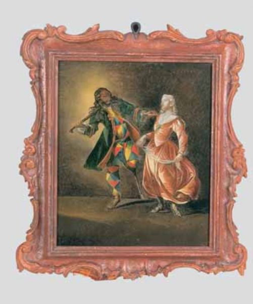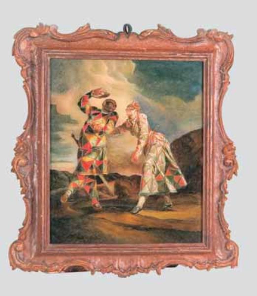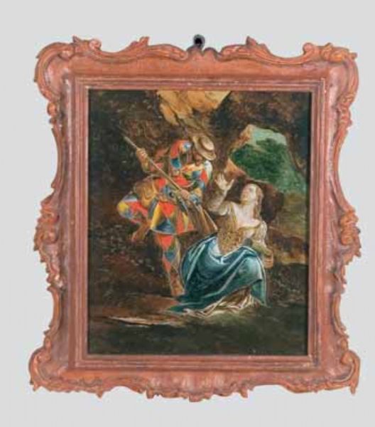 Quattro dipinti sottovetro con scene della vita di Arlecchino