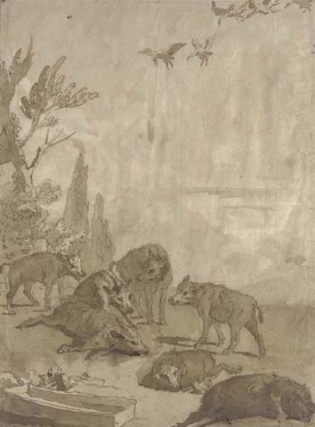 | A pack of wolves with three dead boar, a flock of geese above | |