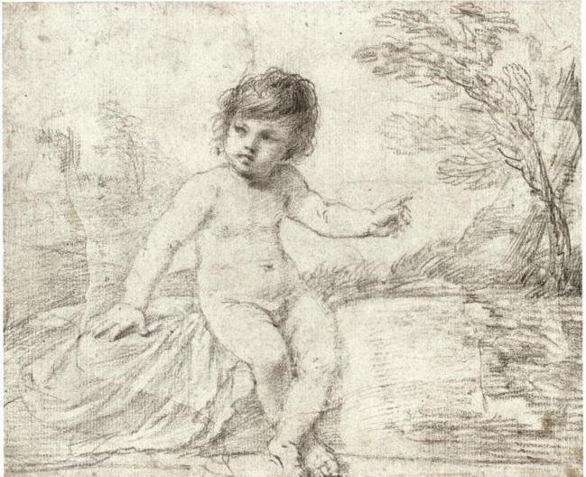 | A CHILD SEATED IN A LANDSCAPE, POINTING TO HIS LEFT | |
