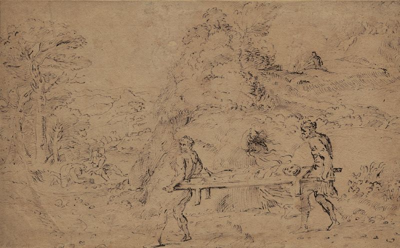 | Landschaft mit dem toten Tankred, der auf einer Bahre davongetragen wird | |