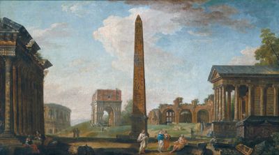 | Roman architectural capriccio with the temples of Saturn, Antoninus Pius, and Faustina, the Basilica of Maxentius, the Arch of T | |