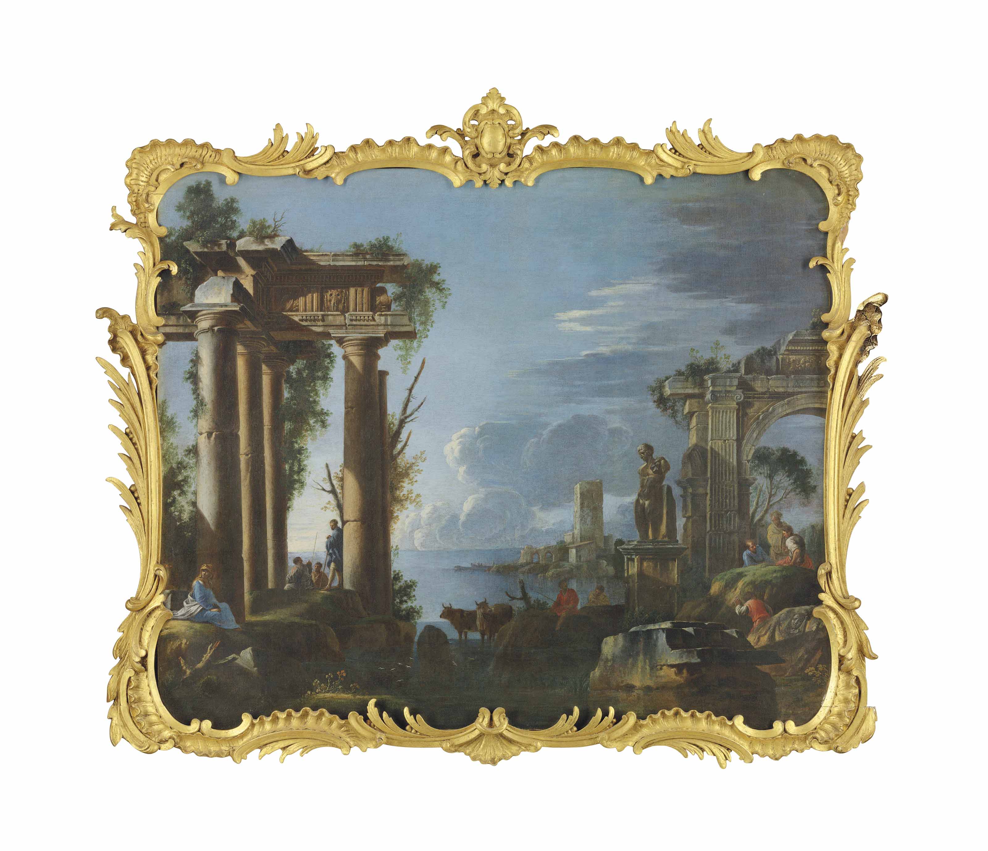 | A capriccio of classical ruins with figures resting by columns and others conversing | |