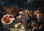 | STILL LIFE OF WATERMELON, PLUMS, PEACHES AND GRAPES, TOGETHER WITH A BASKET OF GRAPES AND POMEGRANATES, ALL IN A LANDSCAPE | |