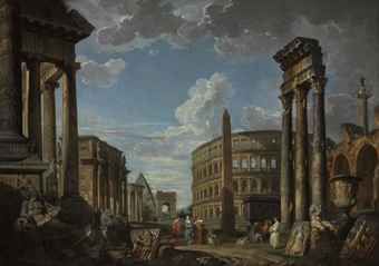 | An architectural capriccio with figures among Roman ruins including the the Temple of Saturn, Arch of Constantine, Temple of Ves | |