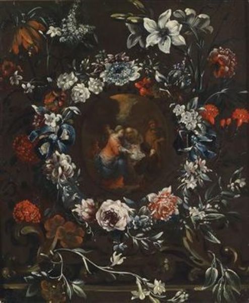 A wreath of flowers enclosing an Adoration of the Shepherds