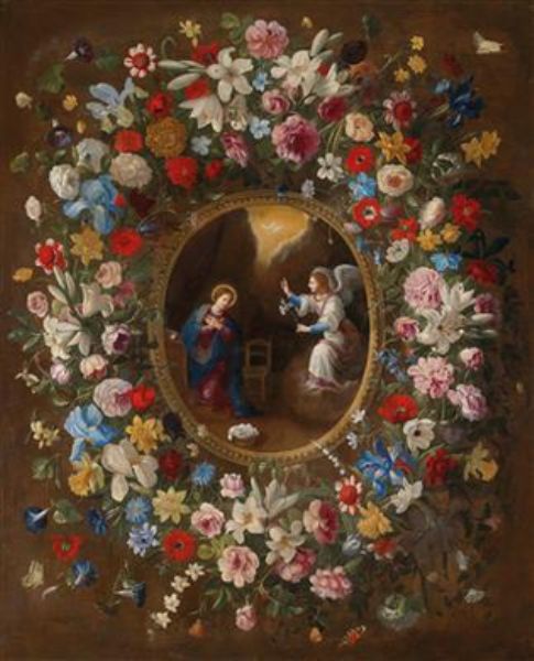 Eine Blumengirlande um ein Medaillon mit einer Verkündigung Mariens