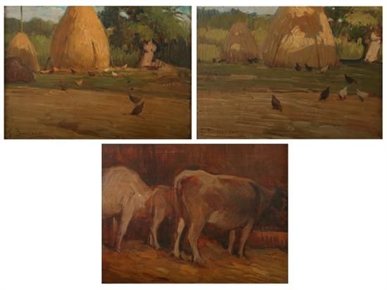 | FARMYARD WITH CHICKENS, HAY STACKS AND CHICKENS and COWS FEEDING: THREE WORKS | |