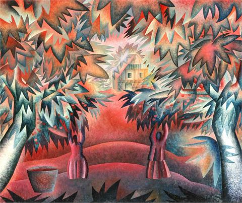 Landschaft mit Obstpflückerinnen und Haus im Hintergrund