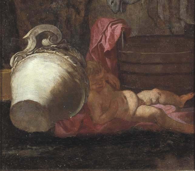PUTTO EBBRO SDRAIATO PRESSO UN VASO E UN TINO