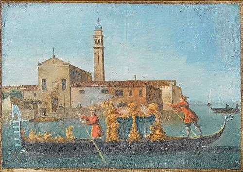 A gondola passing before a lagoon island with a church