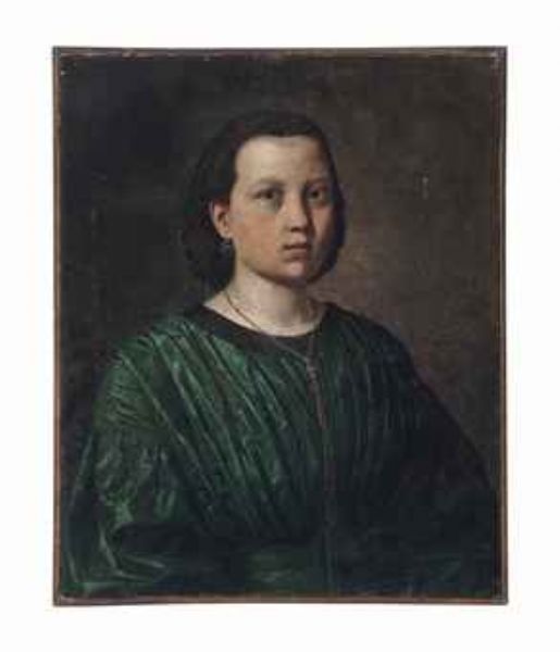 | Portrait of a young woman, half-length, in a green dress and a gold necklace | |