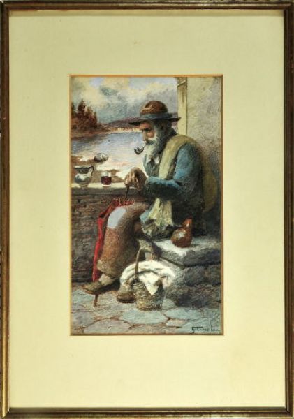 | Älterer Mann mit Pfeife sitzt auf einer Steinbank, neben sich einen Weinkrug und einen Blick auf das Meer im Abendrot | |