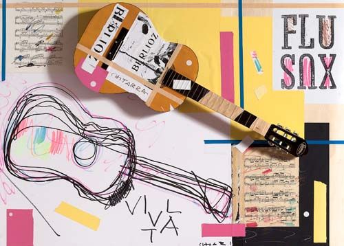 Mixed Technique collage and guitar on board
