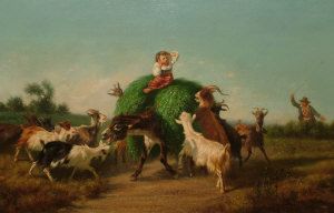 | Boy on a donkey with goats on a country lane and Boy on a donkey with sheep and goats on a hillside | |
