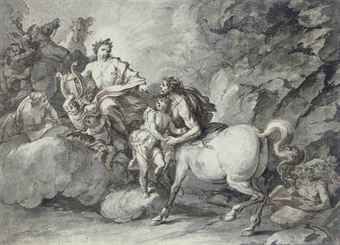 | Apollo handing the infant Asklepios to the Centaur for education | |