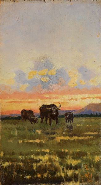 BUFFALOS IN THE COUNTRYSIDE AT THE SUNSET