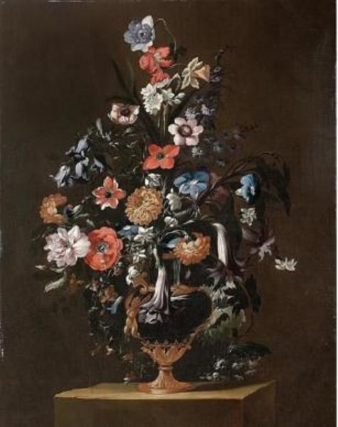 | Roses, Anemones, Jasmine, Marigold and other flowers in a vase with gilded ornamentation; and Poppies, Marigold, Tulips, Larkspu | |