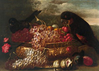 | Still life with a chased metal vessel with grapes, cherries, figs, plums, and birds | |