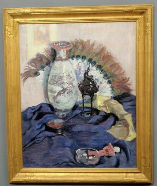 | Still life painting with a vase and peacock feathers with label verso “Gladys Logan Winner” | |