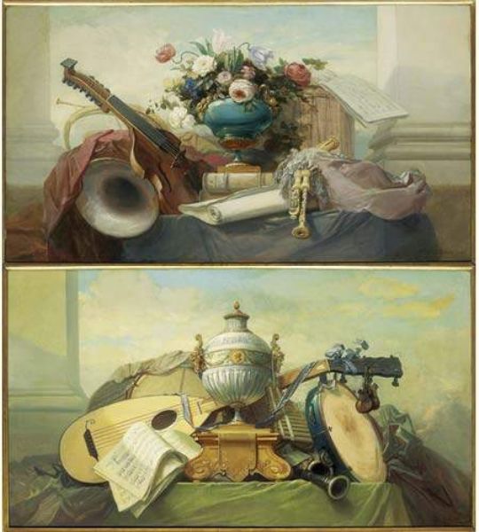 NATURE MORTE AUX INSTRUMENTS DE MUSIQUE SUR DES ENTABLEMENTS