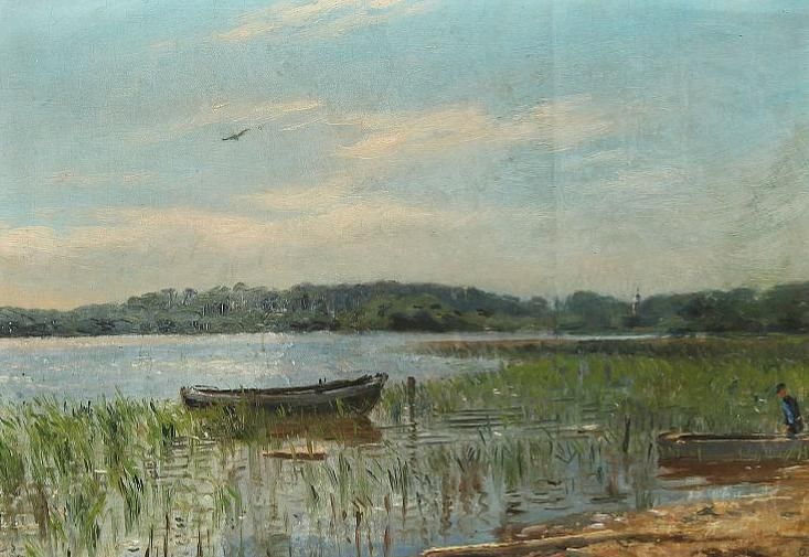 | Landskab with fisherman and rowing boats at the edge of a lake | |