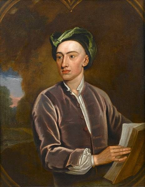 | Portrait of Alexander Pope, half-length, in a mauve velvet coat and green velvet turban, holding a book, a landscape beyond, in | |