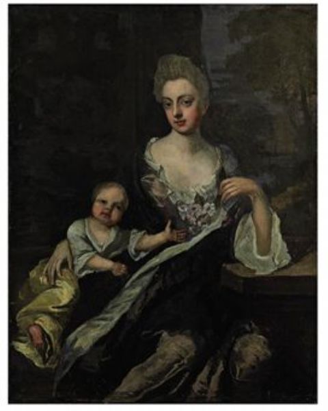 | Portrait of a lady, three-quarter-length, seated, in a lilac dress, her son by her side | |