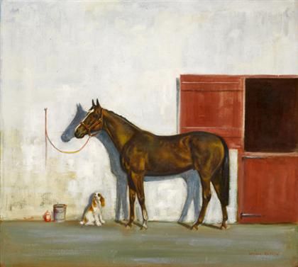 A CHESTNUT BROWN HUNTER AND A COCKER SPANIEL OUTSIDE A STABLE
