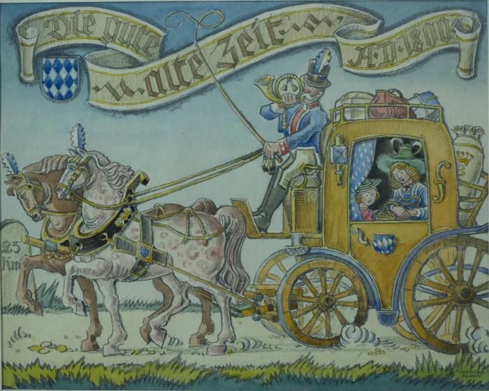 Oben betitelt in Banderolle "die gute alte Zeit "A.D. 1800". Kutsche mit Postellion