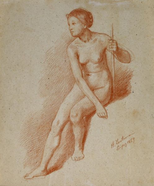 Sitzender weiblicher Akt mit einer Stange in der Hand