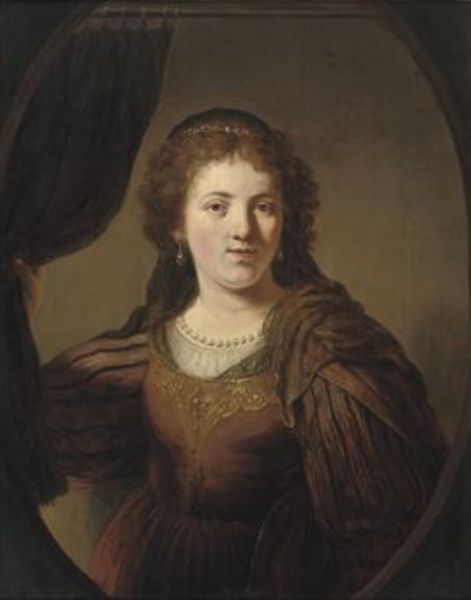 | A 'tronie' of a young woman in an eastern costume drawing a curtain to one side, in a painted oval | |