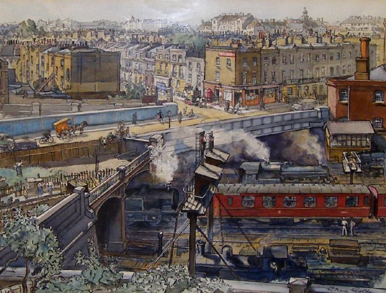 | Urban railway scene with steam trains under a bridge and with busy street scenes beyond | |
