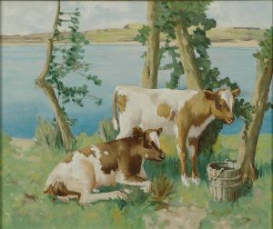 Two calves beside a river