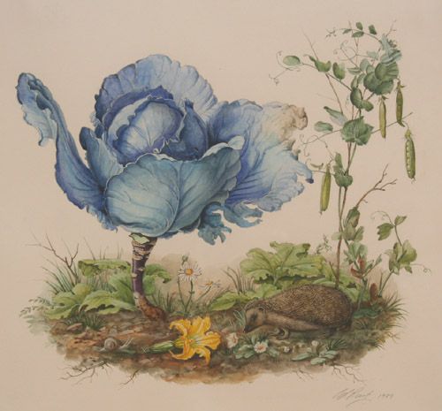 | Botanical Study of a Blue Ornamental Cabbage and Peas beside a Snail and Hedgehog | |
