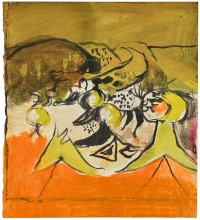 | HILLY LANDSCAPE, ORANGE FOREGROUND AND YELLOW SKY | |