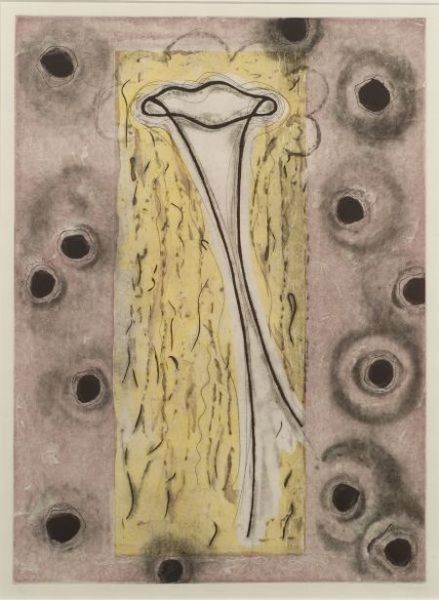 | Etching and aquatint printed in purple and black with collage on paper | |