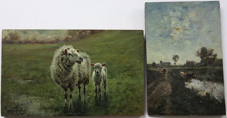 | SHEEP WITH LAMB; FIGURE AND CATTLE BY RIVER | |
