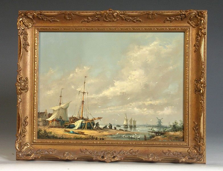 A Dutch coastal scene with beached fishing boats unloading the catch