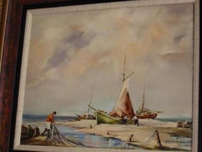 Beach Scene with Fisherman tending their Boats
